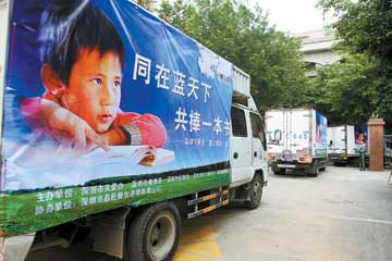 市“關愛辦”副主任吳慧艷介紹說,“深圳市學生愛心捐助”活動源于《深圳商報》的一篇報道。2006年9月,一名來自廣東省連州市的打工青年到《深圳商報》熱線新聞部求助,希望通過報紙發出呼吁,向深圳市民募集舊書籍送往他的家鄉,為缺少課本和課外讀物的學生送去精神食糧?!渡钲谏虉蟆返膱蟮涝谑忻裰幸饦O大反響,不少熱心市民提著成捆成箱的書籍來到報社捐書。一些愛心企業義務組織運輸隊伍將募捐來的書籍送到山區,假期出游的市民也成了捐書活動的“搬運車隊”。一年來,先后有5趟運送書籍的車隊奔赴河源、梅州等地。