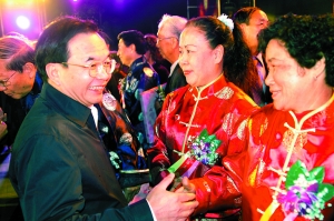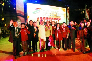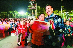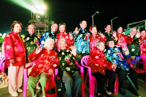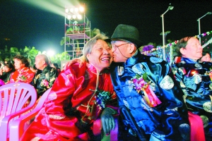 12月18日晚上,東湖大望檳榔公園里,一場特別的集體婚禮正在上演。在中國傳統(tǒng)迎親吹打樂的伴奏下,新人們在舞臺上一拜天地,二拜來賓,夫妻對拜,臺下上百名群眾共同見證了他們“完婚”。之所以說其特別,因為婚禮的主角都是滿頭銀發(fā)的老人。這場集體婚禮由東湖街道專門組織,婚禮主角為轄區(qū)的63對金婚、銀婚老人。