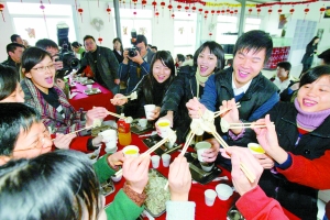 2008年1月31日,“風(fēng)雪阻擋回家路,深圳留你過(guò)大年”青工餃子盛宴在水貝工業(yè)區(qū)舉行。陳發(fā)清 攝