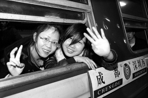 昨晚7時(shí)15分,富士康集團(tuán)專門組織的滿載員工的60輛大巴來(lái)到深圳西站,在深圳西站站長(zhǎng)李飛躍等組織下,車站為他們開(kāi)通“綠色通道”,安排專人舉牌引導(dǎo),為外來(lái)工提供檢票、進(jìn)站、上車的“一條龍”服務(wù)。僅僅15分鐘,乘車農(nóng)民工就幾乎全部進(jìn)入列車車廂。站臺(tái)上寒氣逼人,車廂內(nèi)卻暖意融融,大家臉上都洋溢著回鄉(xiāng)的喜悅。湖南懷化籍女工舒芳芳坐在座位上說(shuō):“以前買火車票要排隊(duì),還不一定買得到,今年沒(méi)想到能夠乘坐專列回家?!睋?jù)列車員介紹,列車主要途經(jīng)湖南、四川兩個(gè)農(nóng)民工大省,明天16時(shí)18分到達(dá)終點(diǎn)站成都。