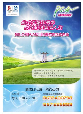 自2008年9月8日起,公司為全體同事提供的一項全新的福利項目——“PCA心理咨詢”就正式為您提供服務啦!