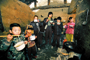 一個廢棄的土坯牛欄沒門沒窗,現在成了孩子們的“飯堂”。記者來到這里時,20多個小鍋隨意地支在墻根,孩子們正在做飯。你倒水,我生火,她切菜……不一會兒,濃煙和一陣陣咳嗽聲彌漫整間屋子。半個小時后,面條煮好了,孩子們站在墻角,“哧溜哧溜”地吃了起來。7歲的趙小蘭