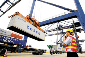 工作人員指揮裝滿活動板房的貨柜裝船。