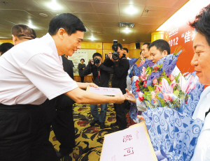 昨日,2012佳兆業白衣天使關愛工程在深圳報業集團舉行。圖為啟動儀式上10位醫護人員代表接過了關愛辦等領導送上的慰問金和鮮花。 本欄攝影深圳商報記者 陳發清