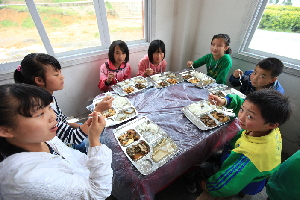 大山深處,午飯鈴聲剛剛響過,從一間間教室里,就跑出來了一群一伙的孩子。他們興高采烈地向一座新近落成的建筑物蜂擁而去。那建筑物里面十分寬敞,大桌子、長條凳,干凈、整齊;墻壁潔白;玻璃窗戶、大門一塵不染。孩子們魚貫而入,拿起擦洗得發亮的餐盤,排隊,打飯。偌大的餐廳,霎時人聲鼎沸。