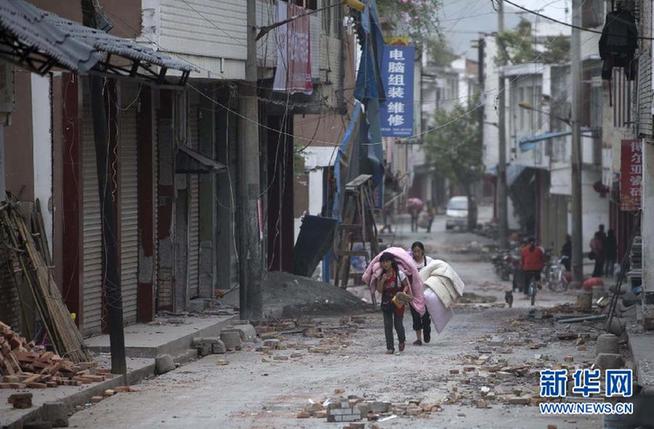 4月20日,一名居民從蘆山縣城內垮塌的房屋前經過。當日,四川雅安蘆山縣發生7.0級地震。其中蘆山縣的龍門鄉、寶盛鄉、太平鎮三地受災最為嚴重。新華社記者 金小明 攝