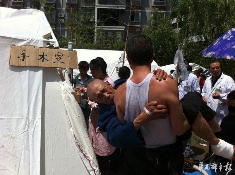 最孝順兒子說:不累!四川蘆山縣醫(yī)院,大量傷員送來,醫(yī)院也受損嚴(yán)重,一平壩搭建成為臨時(shí)帳篷醫(yī)院。手術(shù)室外,一位蘆山男子抱著父親等待手術(shù),沒座位,該男子足足抱了父親一小時(shí),他說,不累!
