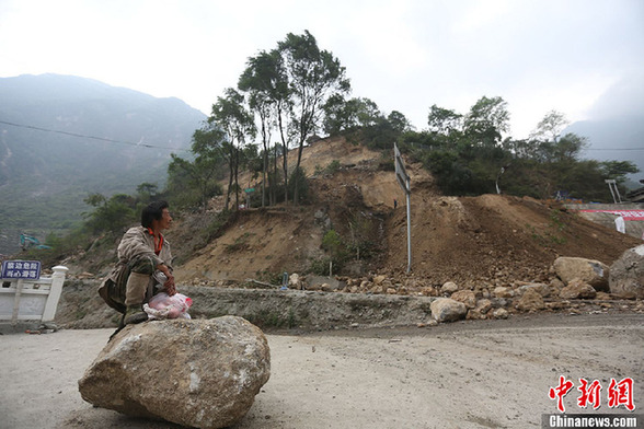 雅安7級地震造成寶興縣城的烈士陵園出現(xiàn)塌方,一名災(zāi)民正蹲在石頭上等待救援。許云峰 攝