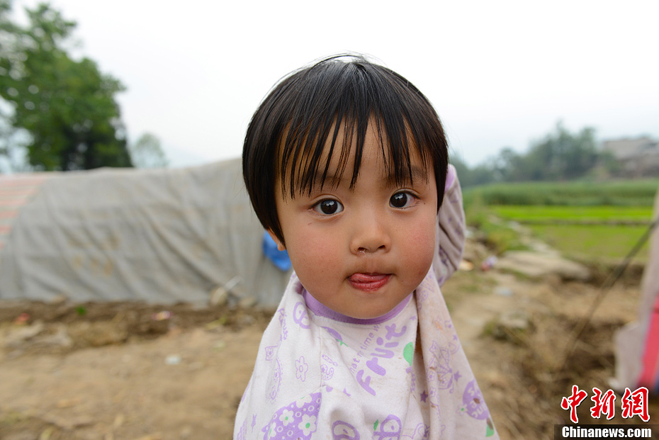 4月21日,四川雅安蘆山縣龍門鄉一位在簡易帳篷外玩耍的小孩。中新社發 張元 攝