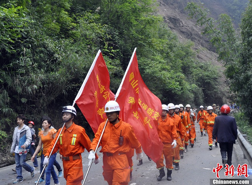 4月21日,四川眉山消防首批34名救援官兵采取間斷徒步行軍和搭乘沿途車輛向寶興挺進,經約3小時行進20余公里,抵達寶興縣城。行進途中救援隊為被飛石砸壞的銀白色面包車中搶救出貴重物品。并護送記者和返鄉民眾70余人安全抵達寶興。救援隊抵達震災區寶興縣城后迅速展開救援等工作。圖為消防官兵徒步前往震災區寶興。中新社發李洋 攝