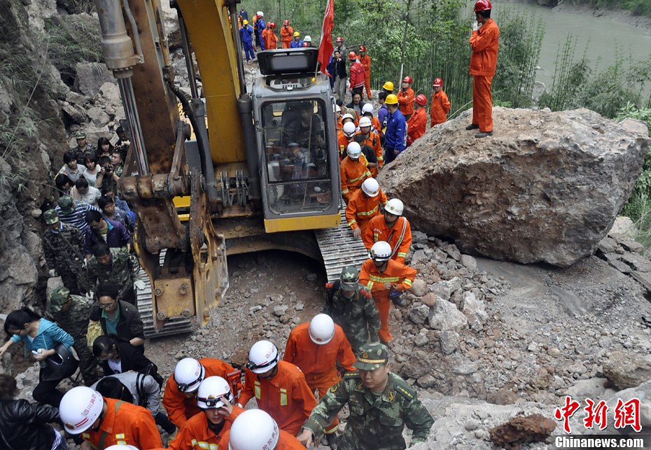 在4.20雅安地震發生后,震區道路堵塞始終是救援死結。圖為山上震下的巨石擋路,救援人員正在小心通過。中新社發 肖遠攝