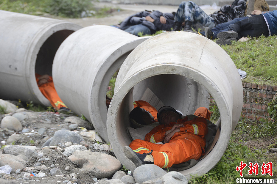 4月21日,四川省雅安市寶興縣靈關鎮,疲憊的救援隊員。中新社發廖攀 攝