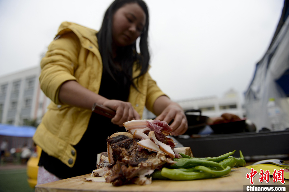 4月21日,四川省雅安市寶興縣靈關鎮,安置在靈關中學的居民動用自家老臘肉做飯。廖攀 攝