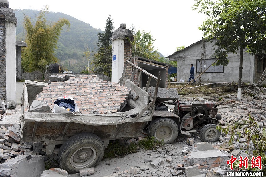 4月21日,四川省雅安市寶興縣靈關鎮,受損的建筑和拖拉機。廖攀攝
