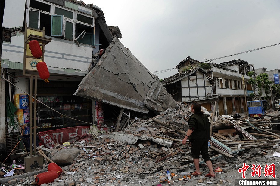 4月21日,四川蘆山縣街道上隨處可見垮塌房屋。4月20日8時2分,四川省雅安市蘆山縣(北緯30.3,東經103.0)發生7.0級地震, 震源深度13公里。中新社發 陳超 攝