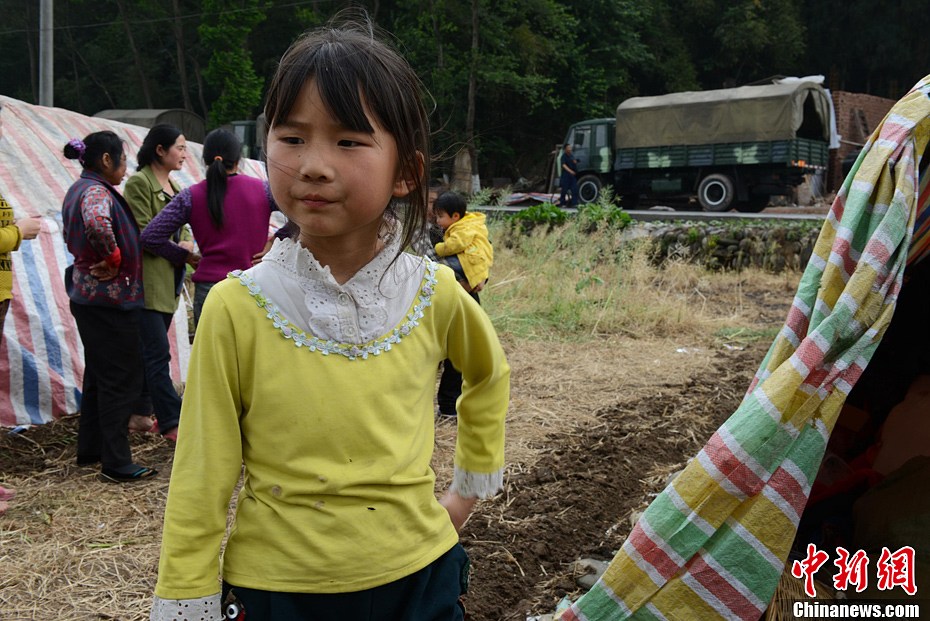 4月21日,住在簡易帳篷里的高夢思。4月20日,蘆山縣龍門鄉,地震發生時9歲的高夢思在和4歲的弟弟在家,一塊木板砸在弟弟的頭上,高夢思一把抱起弟弟到了安全的地方,檢查后弟弟只是受了些輕傷。中新社發張元 攝