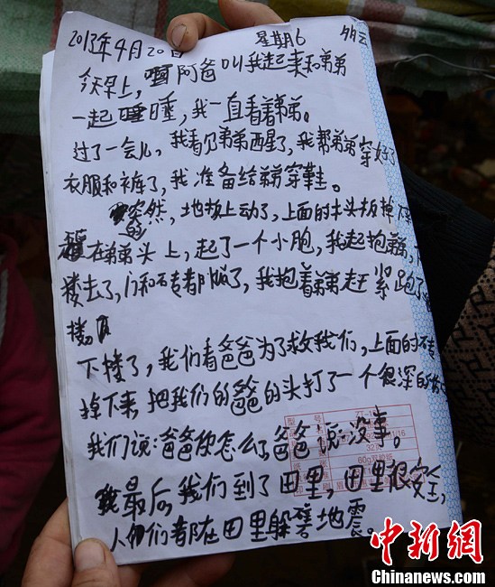 4月21日,圖為高夢思記錄當天事情經過的日記。4月20日,蘆山縣龍門鄉,地震發生時9歲的高夢思在和4歲的弟弟在家,一塊木板砸在弟弟的頭上,高夢思一把抱起弟弟到了安全的地方,檢查后弟弟只是受了些輕傷。中新社發張元 攝