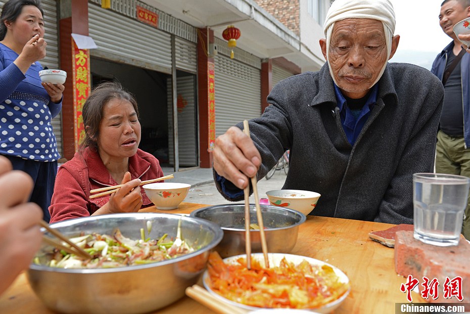 4月21日下午2點,蘆山縣龍門鄉75歲的村民傅玉潤(右一),地震以來第一次吃上了大米飯。從4月20日地震發生時傅玉潤被掉落的磚塊砸傷頭部,現已無大礙。中新社發張元 攝