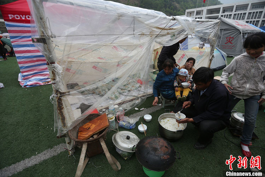 21日傍晚,在寶興縣災民安置點內,一戶人家住在用足球球門改造的帳篷里。許云峰 攝