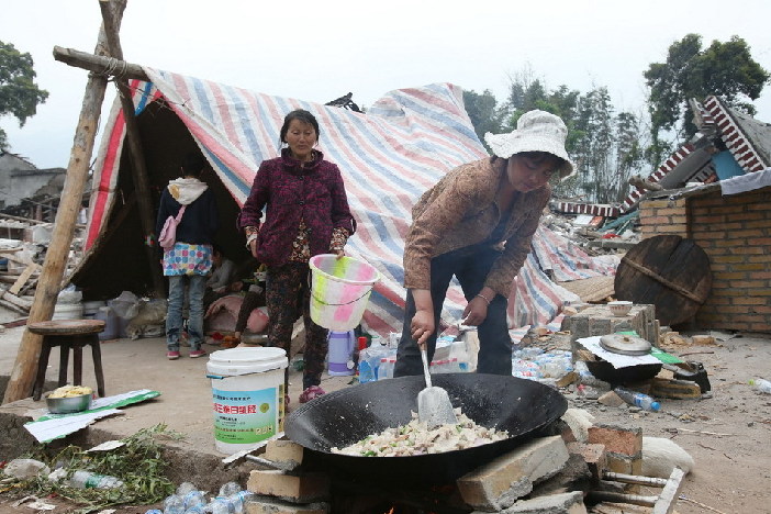 4月21日,蘆山縣龍門鄉(xiāng)古城村村民們在準(zhǔn)備晚飯。新華社記者 金立旺攝