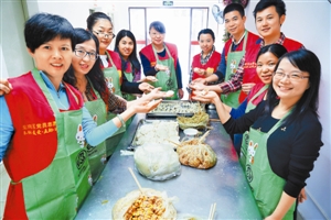 冬至當(dāng)日,平湖街道機關(guān)第一黨支部全體黨員前往街道老年人日間照料中心和職業(yè)康復(fù)中心,為老人和殘疾人包餃子,送上節(jié)日的問候。平湖街道黨工委副書記邵凱洋、組織部長林堅、婦聯(lián)主席謝瓊蓮也參與其中。現(xiàn)場,黨員們分工協(xié)作,緊張忙碌地和面、搟面、剁餡兒、煮餃子……在大家的共同努力下,1000多個餃子在一上午便順利完成。當(dāng)黨員們把熱騰騰的餃子送上老人和殘疾人的餐桌上時,老人和殘疾人紛紛稱贊餃子好吃,并對黨員們的探望表示感謝。一位老人表示,自從來到日間照料中心,她便總是被大家濃濃的關(guān)懷所包圍,不止是逢年過節(jié),平日里也常常有年輕的黨員、義工和愛心人士前來探望。“老人們其實很容易滿足,經(jīng)常有人陪陪他們,就會高興得合不攏嘴。”經(jīng)常參加慰問活動的黨員李女士表示,這樣的活動參加多了,便會在不知不覺中懂得父母、長輩們需要什么,漸漸學(xué)會如何感恩。