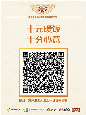 只要輕輕掃碼,捐出十元錢,就能實(shí)現(xiàn)隨手公益,圓環(huán)衛(wèi)工人一頓“暖飯”的心愿。據(jù)悉,此次公益活動(dòng)所捐款項(xiàng)將進(jìn)入美麗深圳公益基金會(huì),全部用于關(guān)愛環(huán)衛(wèi)工人愛心待餐項(xiàng)目。那就別再猶豫啦,快快掃碼加入暖飯派送使者的隊(duì)伍吧!(王博)