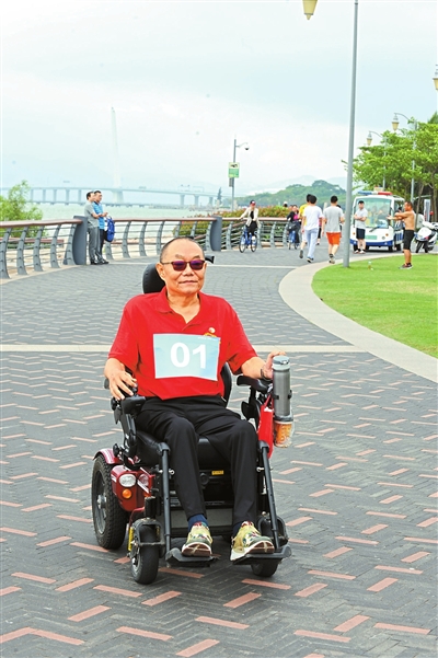 深圳市第三屆“無障礙”樂跑活動形象大使鄭衛寧是當天的1號運動員。他穿著鮮艷的紅色T恤,坐在越野無障礙輪椅上,笑容陽光,充滿自信。鄭衛寧感慨:“無障礙建設是我們殘疾人能獨立生活,能平等地有尊嚴地融入主流社會的基礎。我是懷著感恩之心來參加這個活動的?!?/p>