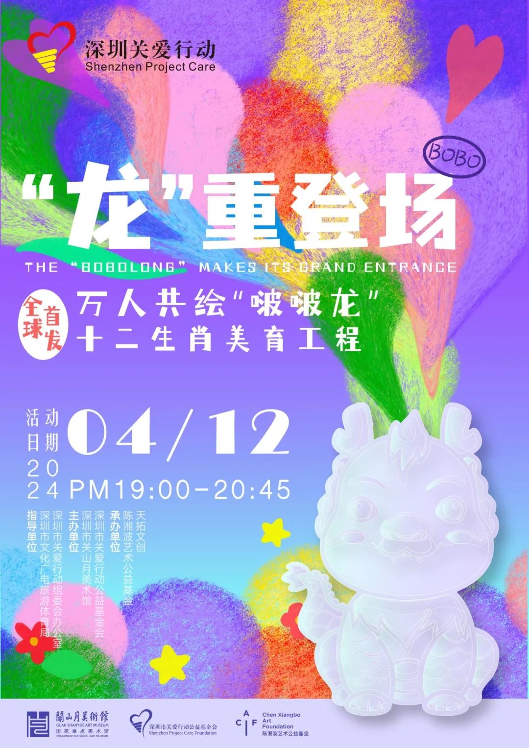 活動(dòng)簡(jiǎn)介:“龍”重登場(chǎng)——萬人共繪“啵啵龍”十二生肖美育工程由深圳市文化廣電旅游體育局和深圳市關(guān)愛行動(dòng)組委辦公室指導(dǎo),深圳市關(guān)山月美術(shù)館等機(jī)構(gòu)聯(lián)合主辦。該活動(dòng)是深圳文旅融合和關(guān)愛行動(dòng)推動(dòng)全城美育+慈善的一次重要探索,致力于打造成深圳美育浸潤和關(guān)愛行動(dòng)文化關(guān)愛的品牌活動(dòng),推動(dòng)深圳“美育之城”的建設(shè)。活動(dòng)將通過彩繪陶瓷“啵啵龍”的形式,鼓勵(lì)市民深入了解并體驗(yàn)十二生肖文化,首批將邀請(qǐng)25組市民參與,包括2組國際友人,以促進(jìn)不同文化的交流與理解。