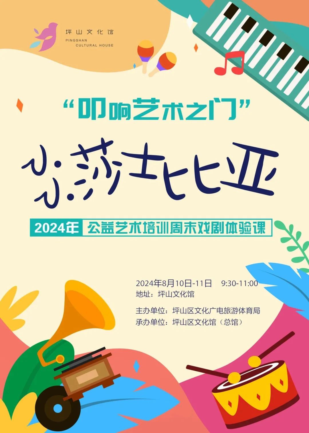 活動簡介:作為“坪山·有戲”戲劇嘉年華的組成部分,坪山文化館全民藝術普及周末課堂推出“小小莎士比亞”系列,融合文學、美術、音樂、舞蹈等多種藝術形式的瑰寶,以其獨特的魅力,為孩子們打開一扇通往多彩世界的大門。
