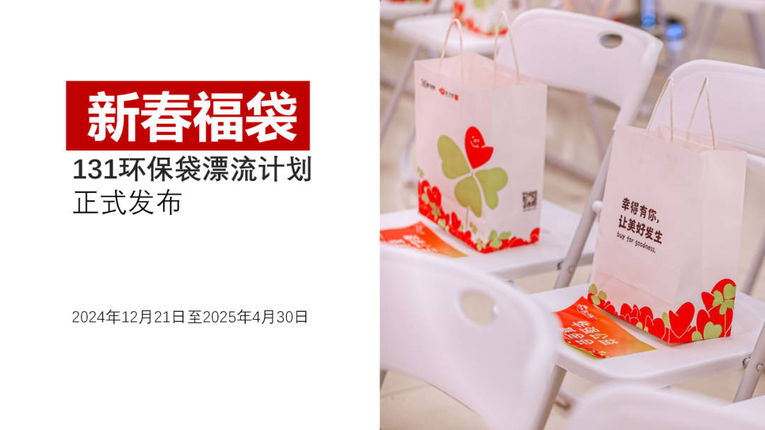 活動簡介:新春福袋131環(huán)保袋漂流行動,是由深圳市小鴨嘎嘎公益文化促進中心聯(lián)合德義慈善·益+小站慈善商店,共同發(fā)起的一次公益行動。該行動希望通過從關愛他人的角度去促進環(huán)保袋重復使用,讓更多人從更為生活化的視角探討可持續(xù)的生產和生活方式,探討以“重復使用”模式有效助力塑料污染治理的可能。